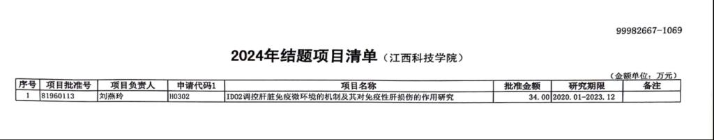 项目《IDO2调控肝脏免疫微环境的机制及其对免疫性肝损伤的作用研究》自获批立项以来,在刘燕玲博士的带领及研究团队的努力下,按照研究计划和年度任务,探究IDO2在肝脏免疫耐受中的重要调控作用。项目历时4年,通过一系列实验研究和理论分析,较为系统地阐述了IDO2在肝脏免疫调节的作用及机制,提供了一种新的靶点分子及方法用来治疗以免疫性损伤为主要特点的肝脏疾病。项目组共发表了SCI论文3篇,培养了硕士研究生3人、中青年教师5人,提升了团队的整体科研能力,也为医学院的自然科学研究明确了研究方向,为后续科研工作开展及进一步申报国家自然基金项目打下了良好的基础。
