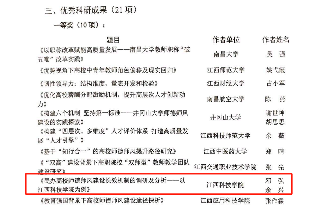 此外,周小丰与人事处邓国印荣获2022-2023年度“全省高等学校人才人事工作先进个人”荣誉称号,论文《民办高校师德师风建设长效机制的调研及分析—以江西科技学院为例》荣获“全省高校人事管理研究会优秀科研成果奖”一等奖。