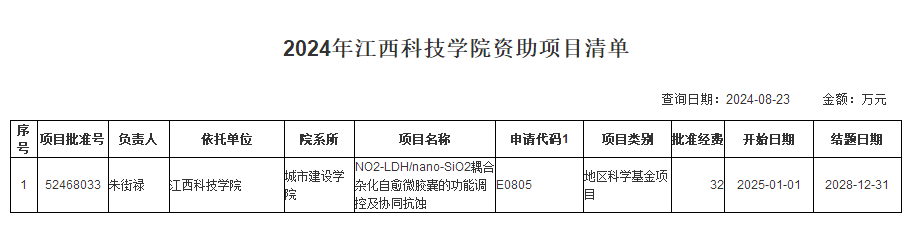 江科网讯(通讯员 科研处)8月23日,国家自然科学基金委员会公布了2024年度国家自然科学基金项目评审结果。我校城市建设学院绿色建筑研究所朱街禄博士主持的项目《NO2-LDH/nano-Si02耦合杂化自愈微胶囊的功能调控及协同抗蚀》(项目编号:52468033)获地区科学基金项目立项,直接资助经费32万元。这是我校近年来获批的第9项国家自然基金项目,也是绿色建筑研究所获批的第2个国家自然基金项目。
