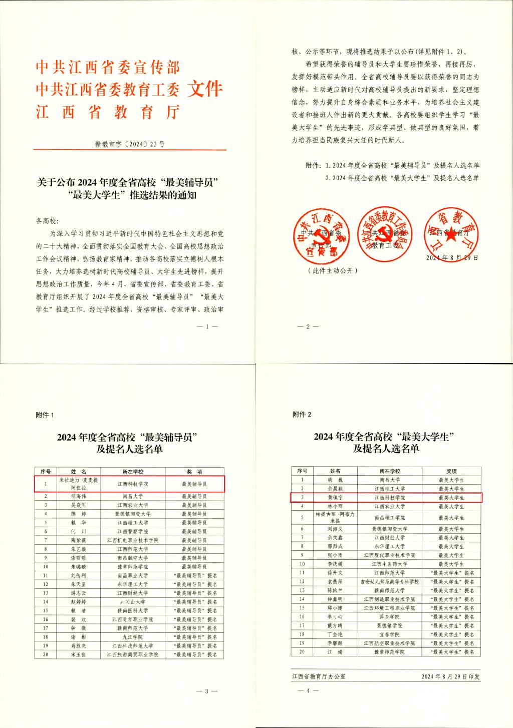 据了解,今年4月,省委宣传部、省委教育工委、省教育厅组织开展了2024年度全省高校“最美辅导员”“最美大学生”推选工作。经过学校推荐、专家评审、政治审核、公示等环节,最终推选出“最美辅导员”“最美大学生”各10人和“最美辅导员”“最美大学生”提名各10人。