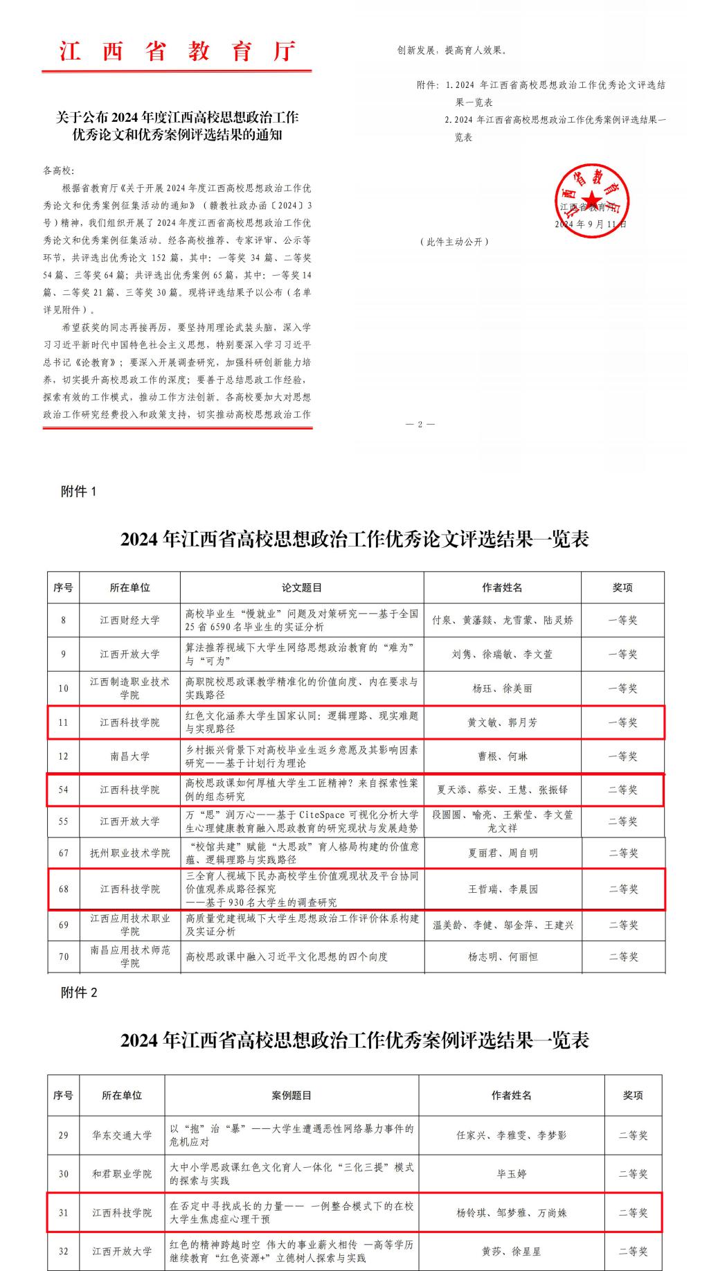 其中,黄文敏、郭月芳的《红色文化涵养大学生国家认同:逻辑理路、现实难题与实现路径》获得2024年度全省高校思想政治工作优秀论文一等奖,夏天添、蔡安、王慧、张振铎的《高校思政课如何厚植大学生工匠精神?来自探索性案例的组态研究》和王哲瑞、李晨园的《三全育人视域下民办高校学生价值观现状及平台协同价值观养成路径探究——基于930名大学生的调查研究》分别获得2024年度全省高校思想政治工作优秀论文二等奖,杨铃琪、邹梦雅、万尚姝的《在否定中寻找成长的力量——一例整合模式下的在校大学生焦虑症心理干预》获得2024年度全省高校思想政治工作优秀案例二等奖。