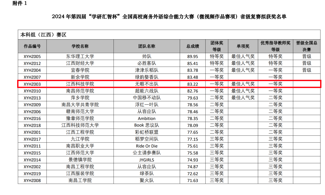 江科网讯(外国语学院)近日,第四届“学研汇智杯”全国高校商务外语综合能力大赛省级复赛圆满结束,由我校外国语学院吴雯倩、郭天水、罗雅轩、郑虹、马宇轩等5位同学组成的“无暇不出”队荣获江西省赛区一等奖和最佳人气奖,刷新我校在该项赛事中创造的最佳成绩。