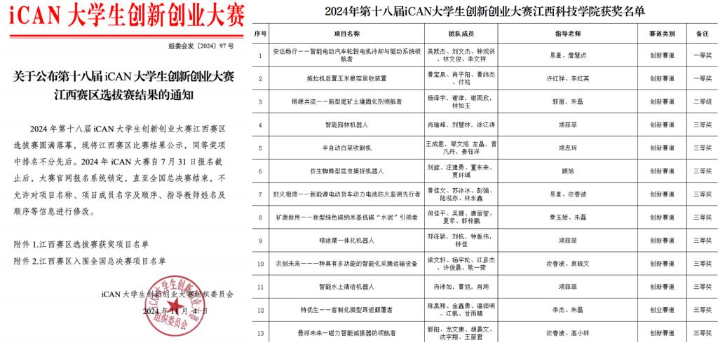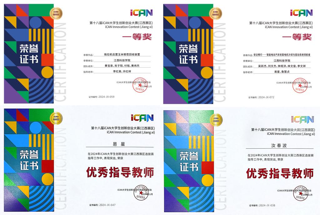 江科网讯(人工智能学院)日前,第十八届iCAN大学生创新创业大赛江西赛区选拔赛圆满结束。我校共派出14支队伍参赛,历经布展、路演、答辩及评审等环节,最终取得突破性的可喜成绩,斩获13个奖项,获奖总数位列全省高校第三、全省民办高校第一。其中一等奖2项、二等奖1项、三等奖10项,我校荣获“优秀组织单位”,协同创新中心易星和人工智能学院汝春波两位老师荣获“优秀指导老师”。