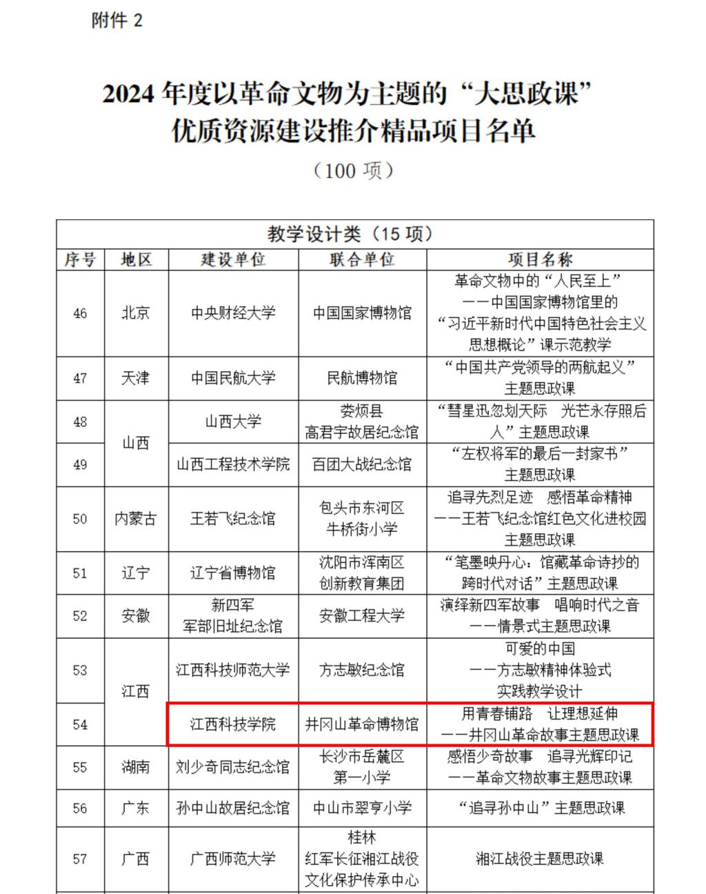 江科网讯(记者 何强江)近日,国家文物局办公室和教育部办公厅公布了2024年度以革命文物为主题的“大思政课”优质资源建设推介项目评选结果,评选出10个示范项目和100个精品项目。我校马克思主义学院辛绍南教授团队申报的《用青春铺路 让理想延伸——井冈山革命故事主题思政课》入选精品项目名单。我校是全国唯一一所入选的民办本科高校。