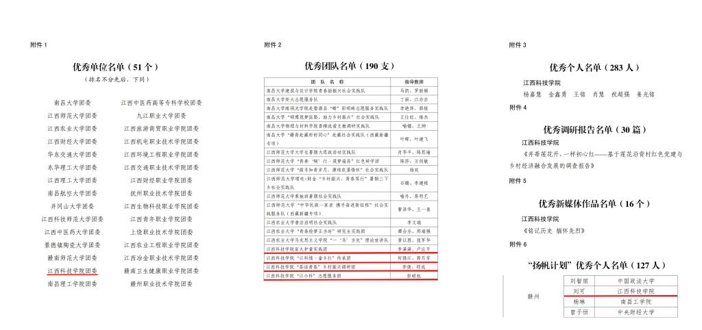 其中,江西科技学院团委荣获省级优秀单位,江西科技学院星火护童实践团(指导老师:李满满、卢应平)、江西科技学院“江科情·畲乡红”传承团(指导老师:何强江、郭月芳)、江西科技学院“茶话青春”乡村振兴调研团(指导老师:李倩、邱成)、江西科技学院“江小科”志愿服务团(指导老师:彭昭旭)荣获优秀团队,杨嘉慧、金鑫勇、王铭、肖慧、祝超强、姜光铭等荣获优秀个人,《并蒂莲花开,一样初心红——基于莲花沿背村红色党建与乡村经济融合发展的调查报告》荣获优秀调研报告,《铭记历史 缅怀先烈》荣获优秀新媒体作品,刘可荣获“扬帆计划”优秀个人。