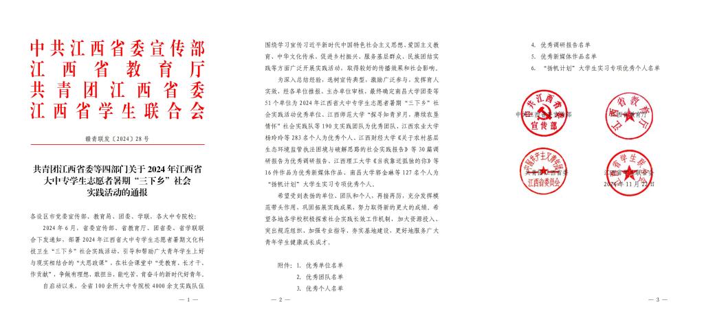江科网讯(记者 何强江)日前,从省委宣传部、省教育厅、团省委、省学联联合下发的《共青团江西省委等四部门关于2024 年江西省大中专学生志愿者暑期“三下乡”社会实践活动的通报》赣青联发〔2024〕28号文件获悉,我校荣获优秀单位1个、优秀团队4支、优秀个人6名、优秀调研报告1篇、优秀新媒体作品1个、“扬帆计划”优秀个人1人。