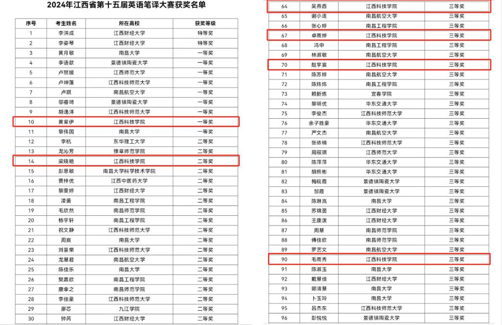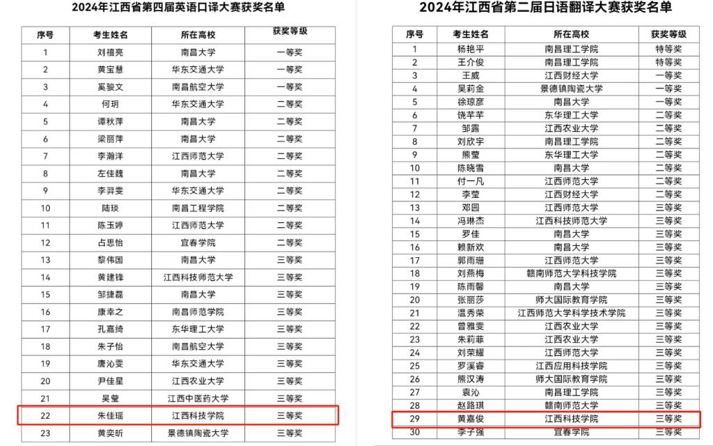 江科网讯(通讯员 戴睿 记者 何强江)日前,2024年江西省第十五届英语笔译大赛、江西省第四届英语口译大赛和第二届日语笔译大赛的决赛均已落下帷幕。经过学校预赛的选拔和决赛的激烈角逐,我校学子共计获得一、二、三等奖共计8个奖项。