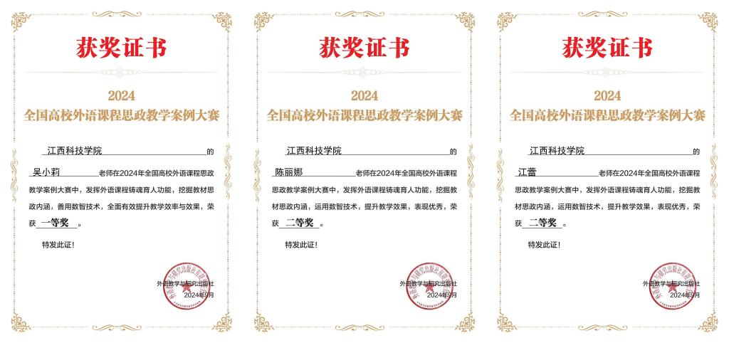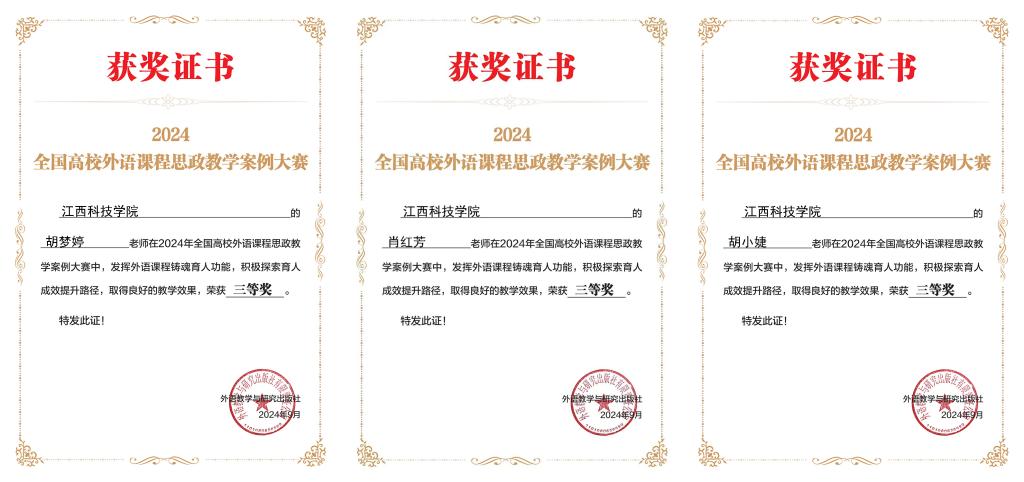 江科网讯(外国语学院)近日,2024年全国高校外语课程思政教学案例大赛落下帷幕。我校外国语学院教师团队紧扣思政主题,深入挖掘教材育人元素,经过数月的精心筹备与激烈竞争,凭借出色的教学设计和深厚的思政教育功底在大赛中脱颖而出。其中,吴小莉老师荣获主赛道一等奖,陈丽娜老师荣获主赛道二等奖,胡梦婷、肖红芳两位老师荣获主赛道三等奖;江蕾老师荣获主赛道二等奖,胡小婕老师主赛道荣获三等奖。