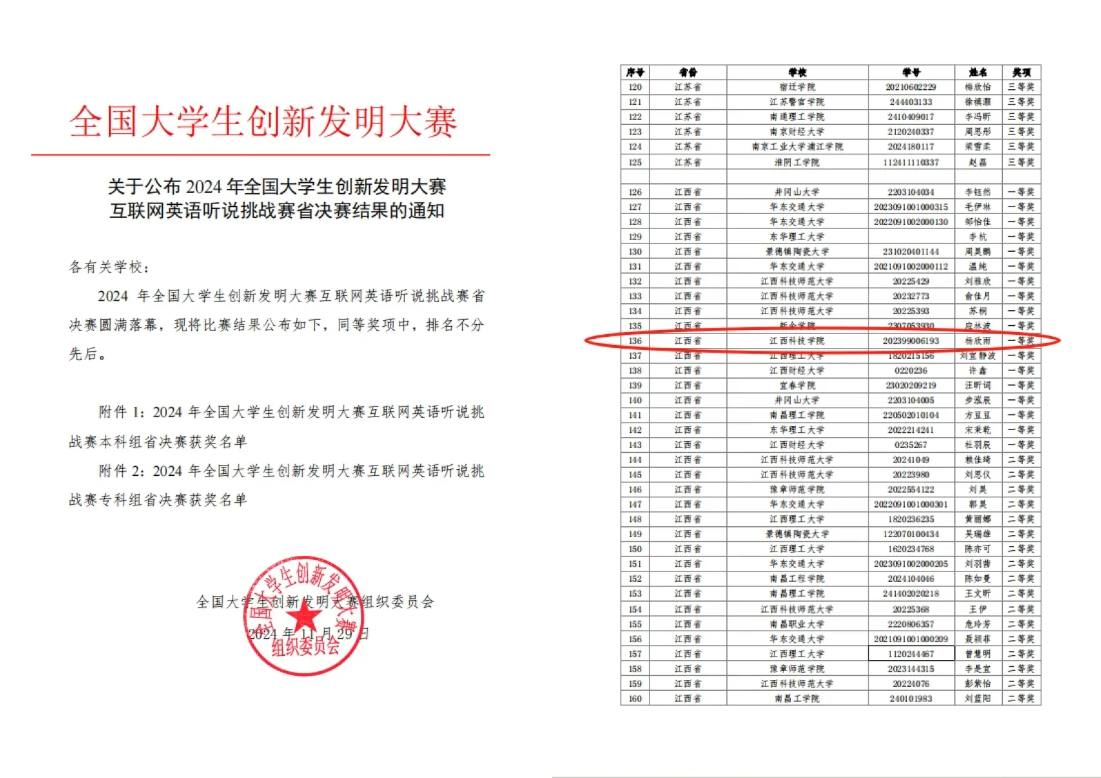 江科网讯(通讯员 外国语学院)近日,2024年全国大学生创新发明大赛互联网英语听说挑战赛江西省决赛在线上圆满落幕。我校外国语学院英语专业学子杨欣雨依靠扎实的语言功底和流利的表达在比赛中脱颖而出,荣获江西省一等奖,并将凭借全省第11名的优异成绩赴南京参加国赛。