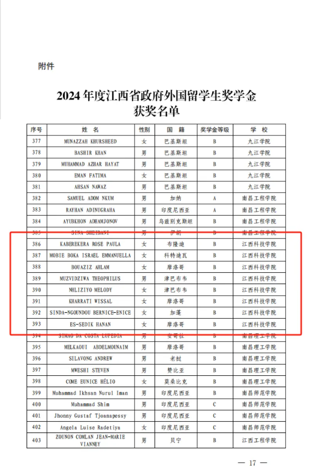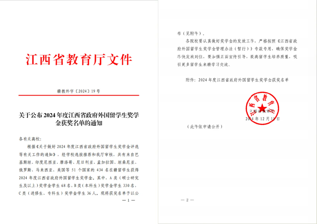 江科网讯(记者 何钰馨)近日,江西省教育厅公布2024年度江西省政府外国留学生奖学金评选结果,经选拔推荐和审核等环节,我校来自布隆迪、科特迪瓦、摩洛哥、津巴布韦、加蓬等5个国家的8名国际留学生荣获2024年度江西省政府外国留学生B 类(本科生)奖学金。