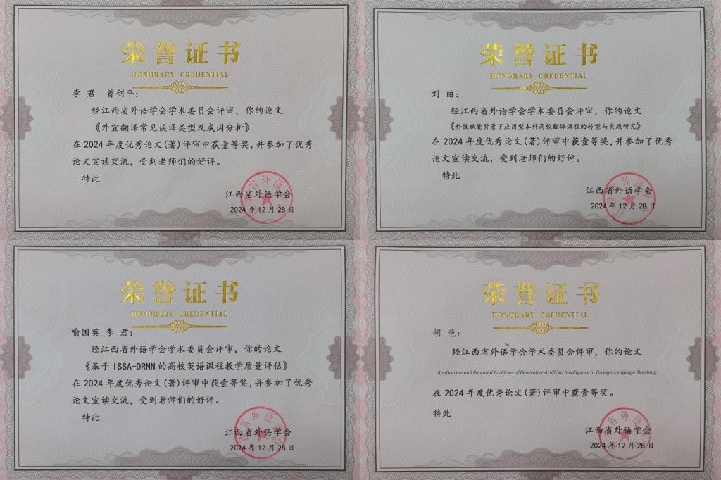 江科网讯(通讯员 戴睿)12月28日,江西省外语学会2024年学术年会在昌举行。在本届年会的年度优秀论文(著)评选活动中,我校外国语学院教师获得4项一等奖与5项三等奖的优异成绩,刷新了学校历年在此类评选中的最佳成绩。外国语学院院长李君和教师喻国英、刘丽受邀参加优秀论文的宣读与交流,获得与会者的好评。