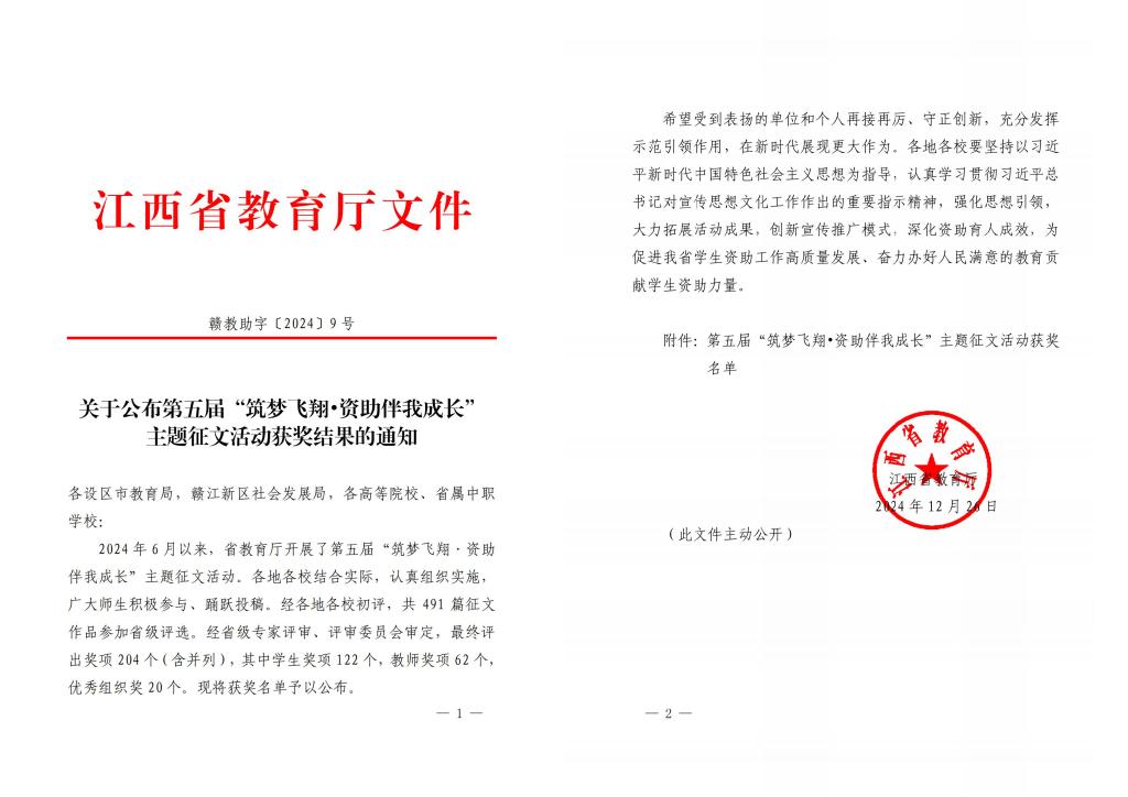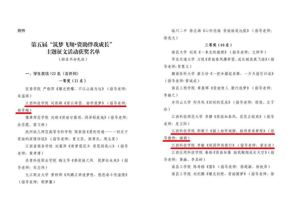 江科网讯(通讯员 杨翠梅)近日,江西省教育厅公布第五届“筑梦飞翔·资助伴我成长”主题征文活动获奖结果,我校财经学院刘雨婷同学《资以希望,助学筑梦》(指导老师:杨翠梅)荣获学生组一等奖,文化与传媒学院邵紫兰同学《插上助学翅膀,接续青春梦想》(指导教师:谢娟)、李敏同学《祖国伴我前行》(指导老师:梁亚波)荣获学生组三等奖。