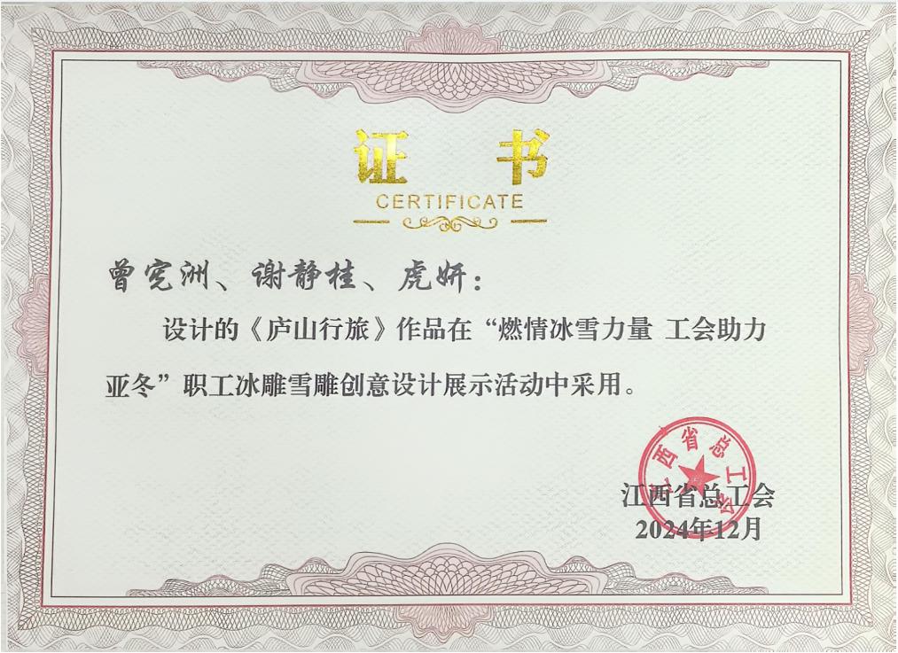 作品《庐山行旅》突出江西特色,经江西省教育工会和总工会组织推送以及组委会筛选后成功入选,最终由黑龙江省总工会组织专业团队,结合原设计进行雕刻并集中展示,供全国职工参观打卡。我校教师的设计作品在“燃情冰雪力量 工会助力亚冬”职工冰雕雪雕创意设计展示活动中被采用,不仅体现了三位教师在艺术创作领域的卓越实力,也彰显了我校在艺术教育和创新能力方面的突出成果。这是我校全面贯彻美育教育、推动艺术与实践相结合的生动体现。