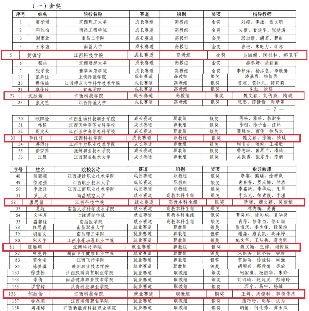 江科网讯(通讯员 魏文颖 记者 何强江)日前,从江西省教育厅下发的《关于公布第三届江西省大学生职业规划大赛结果的通知》文件获悉,我校继在第一、二届获得全省优秀组织奖、获奖牌数最多的民办高校后,本届又以1金4银1铜的佳绩实现金奖“零的突破”,在全国大学生职业规划大赛的省赛舞台上写下浓墨重彩的一笔。招就处教师魏文颖荣获大赛组织工作先进个人,吴丽娟、闵桂林、郝卫军荣获优秀指导老师奖。