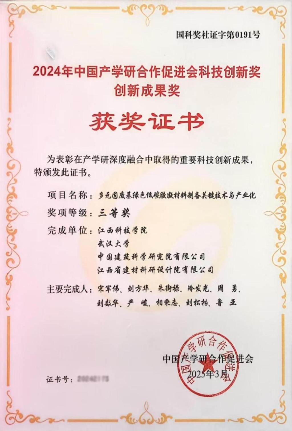 江科网讯(通讯员 刘方华 记者 何强江)日前,第十六届中国产学研合作创新大会在北京召开。会议表彰了在产学研深度融合方面作出突出贡献的先进单位、个人和创新成果。由我校宋军伟副校长科研团队完成的产学研合作项目《多元固废基绿色低碳胶凝材料制备关键技术及产业化》荣获2024年度中国产学研合作促进会科技创新奖创新成果奖三等奖。该奖项是中国产学研领域最高荣誉奖。