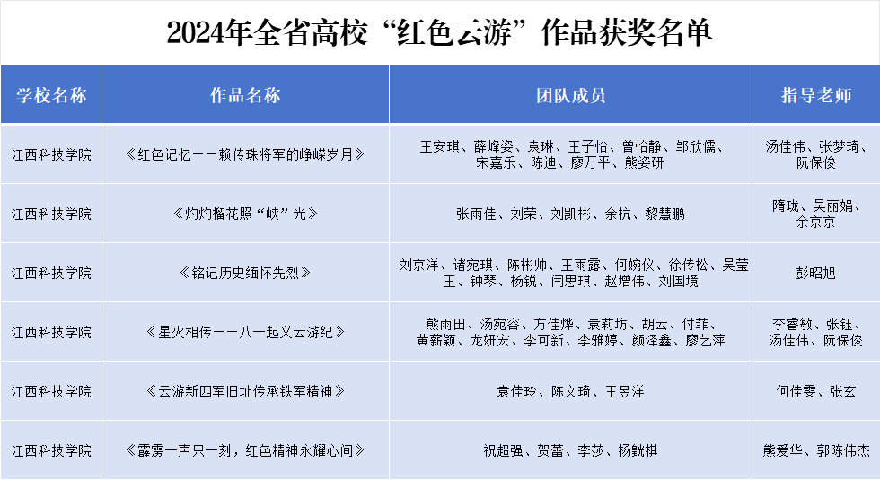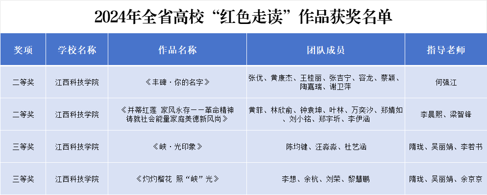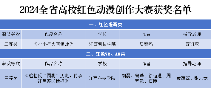 江科网讯(记者 何强江)日前,江西省教育厅公布了2024年度“红色走读”红色动漫创作大赛等活动评选结果,我校喜获佳绩。其中,获全省高校“红色云游”作品6项,“红色走读”优秀作品二等奖2项、三等奖2项,“红色动漫”创作大赛二等奖1项、三等奖1项。