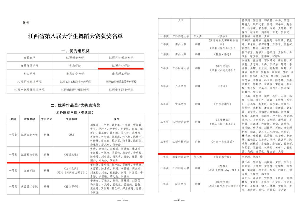 江科网讯(记者 何强江)日前,从江西省文学艺术界联合会、江西省教育厅联合发文的《关于公布江西省第八届大学生舞蹈大赛获奖名单的通知》获悉,我校教育学院的参赛作品群舞《晒场秋歌》获得本科院校甲组(普通组)一等奖、音乐舞蹈学院的参赛作品群舞《一念一生之海昏》获得本科院校乙组(专业组)三等奖,查尔雅、赵紫浩、高远志三位老师获得优秀编导奖/优秀指导老师奖,江西科技学院获得优秀组织奖。