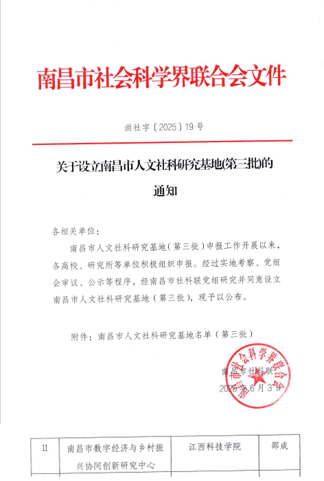 江科网讯(通讯员 刘占先)近日,南昌市社科联发布了《关于设立南昌市人文社科研究基地(第三批)的通知》(洪社字〔2025〕19号),我校经济管理学院邵成副教授牵头申报的“南昌市数字经济与乡村振兴协同创新研究中心”获批设立。这是我校继获批“南昌市产业数字化转型立法与政策研究基地”“南昌市新能源汽车产业发展研究中心”后,再次获批市社联人文社科研究基地。