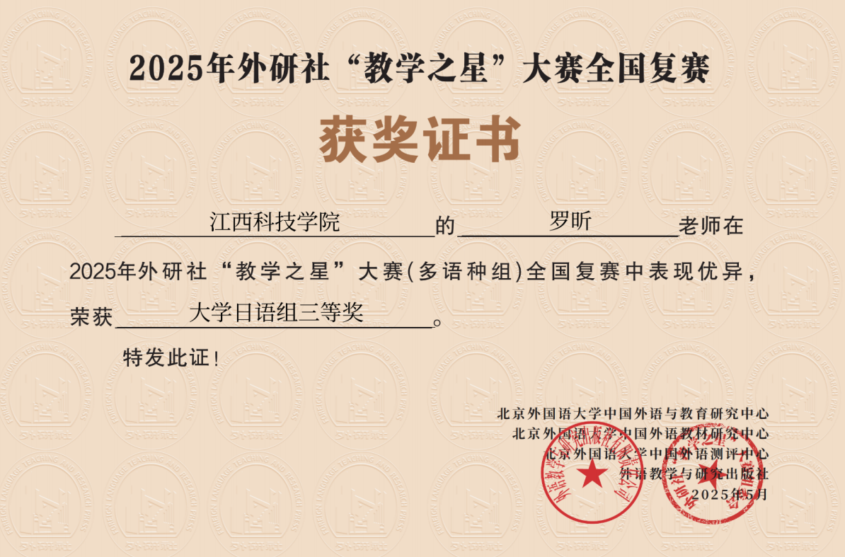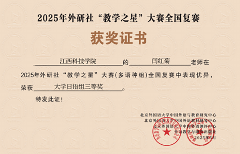 江科网讯(通讯员 闫红菊)近日,2025年外研社“教学之星”大赛(多语种组)全国复赛圆满落幕。我校外国语学院闫红菊、罗昕两位日语老师凭借扎实的专业功底、独特的教学设计,获全国复赛三等奖。