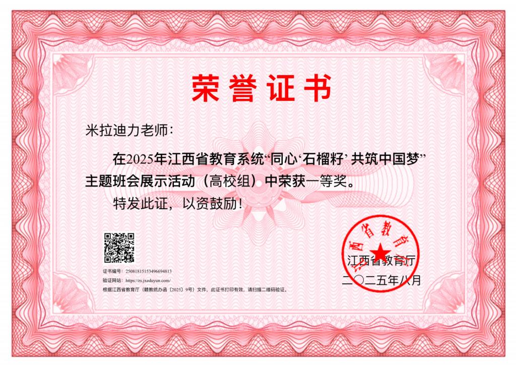 江科网讯(通讯员 王颖)近日,江西省教育厅公布了2025年全省教育系统“同心‘石榴籽’ 共筑中国梦”主题班会展示活动评选结果,我校辅导员米拉迪力·麦麦提阿伍拉荣获一等奖,充分彰显了学校在铸牢中华民族共同体意识教育中的扎实成效。