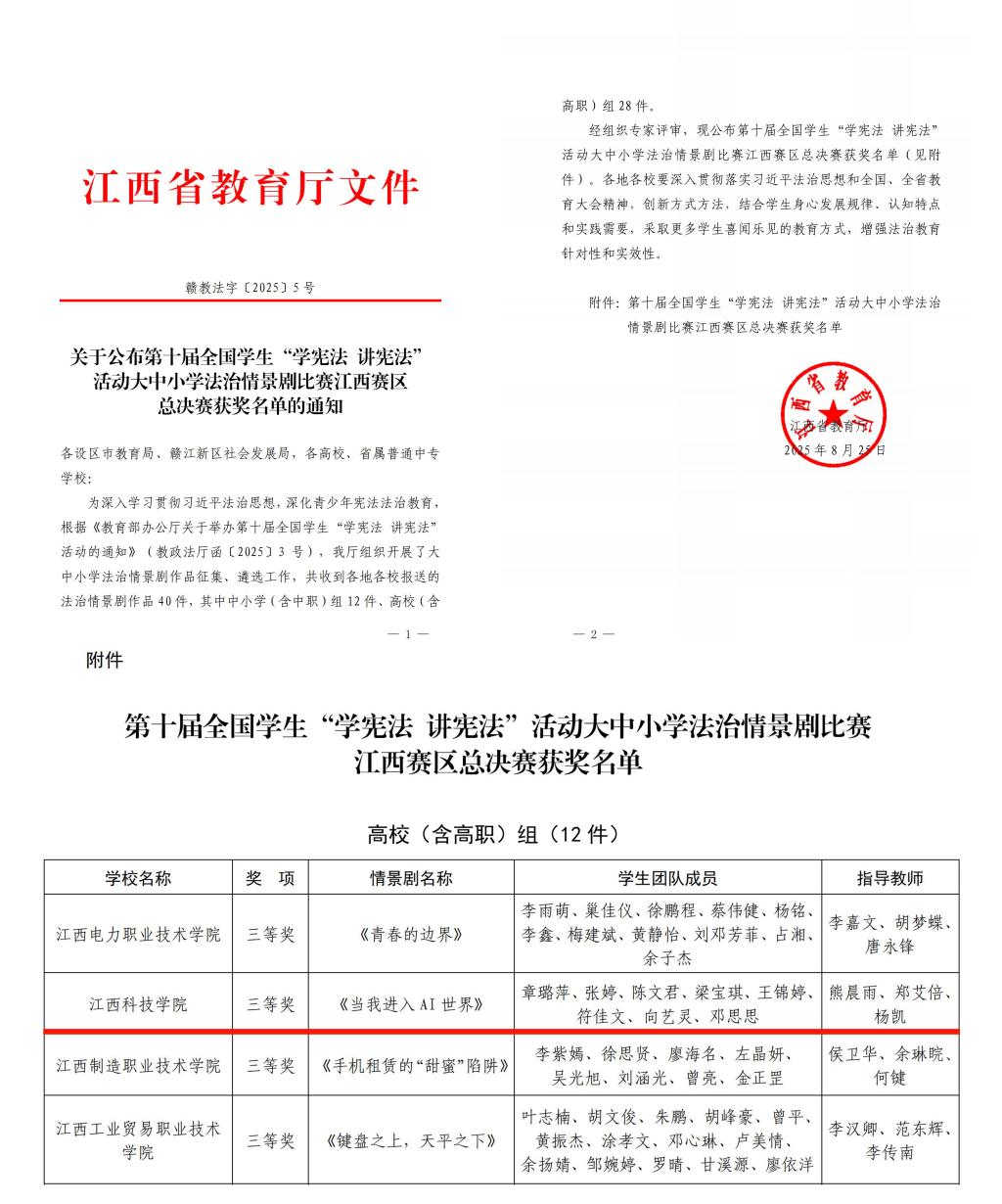 江科网讯(记者 何强江)近日,江西省教育厅公布第十届全国学生“学宪法 讲宪法”活动大中小学法治情景剧比赛江西赛区总决赛获奖名单,我校作品《当我进入AI世界》荣获三等奖。