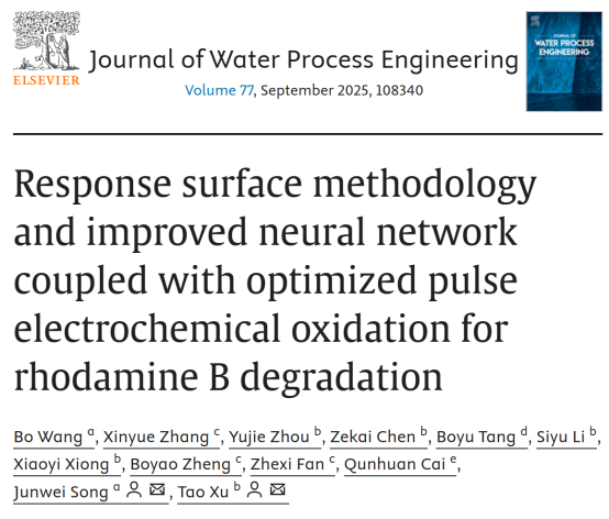 相关成果以“Response surface methodology and improved neural network coupled with optimized pulse electrochemical oxidation for Rhodamine B degradation”为题,发表在《Journal of Water Process Engineering》。江西科技学院为论文第一通讯单位,论文第一作者为先进材料与绿色能源研究院王波博士,宋军伟副校长为论文通讯作者,论文受到湖南省自然科学基金((2025JJ60080)资助。