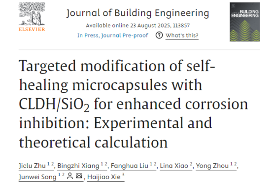 相关成果以“Targeted modification of self-healing microcapsules with CLDH/SiO2for enhanced corrosion inhibition: Experimental and theoretical calculation”为题,发表在《Journal of Building Engineering》。江西科技学院为论文第一通讯单位,论文第一作者为先进材料与绿色能源研究院朱街禄院长,宋军伟副校长为论文通讯作者,论文受到国家自然科学基金(52468033)资助。