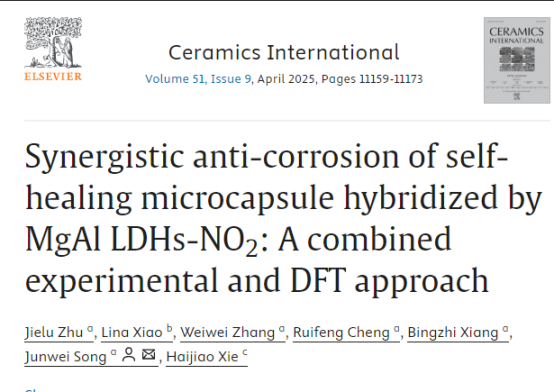 相关成果以“Synergistic anti-corrosion of self-healing microcapsule hybridized by MgAl LDHs-NO2: A combined experimental and DFT approach”为题,发表在《Ceramics International》。江西科技学院为论文第一通讯单位,论文第一作者为先进材料与绿色能源研究院朱街禄院长,宋军伟副校长为论文通讯作者,论文受到国家自然科学基金(52468033)资助。