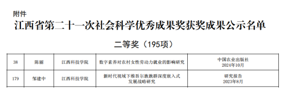 江科网讯(科研处)近日,江西省第二十一次社会科学优秀成果奖获奖结果正式公布,我校经济管理学院陈丽博士的著作《数字素养对农村女性劳动力就业的影响研究》和习研中心邹建中副教授的研究报告《新时代视域下维吾尔族族群深度嵌入式发展战略研究》2项成果荣获第二十一次社会科学优秀成果奖二等奖。