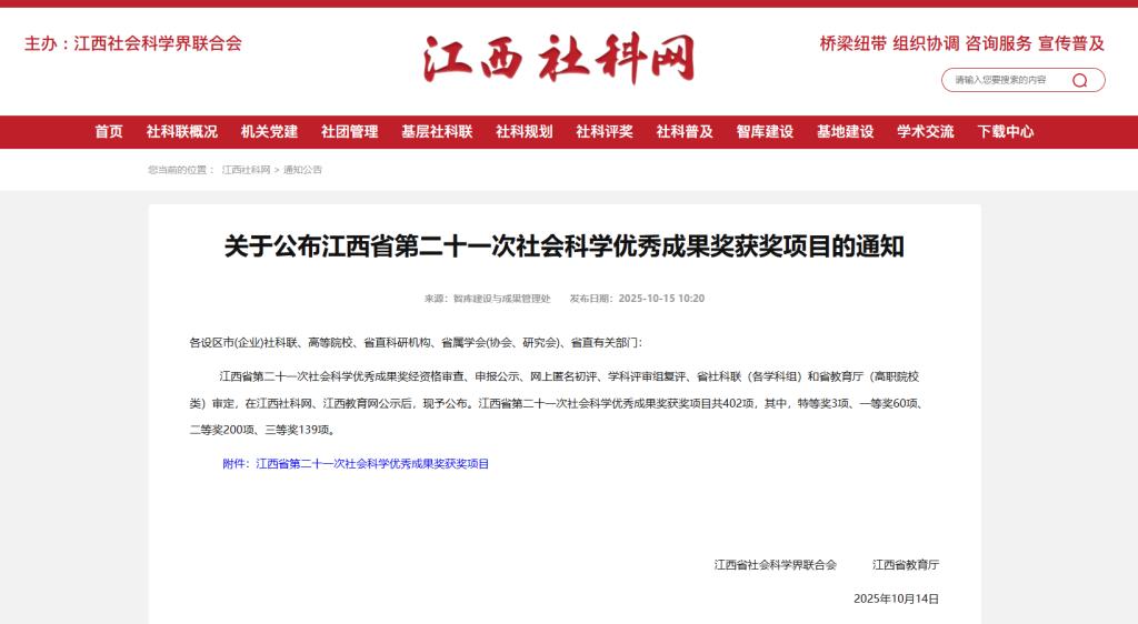 据悉,江西省社会科学优秀成果奖是江西省哲学社会科学研究领域的最高奖项,每两年评选一次,学术权威性强,获奖成果在相关研究领域具备较高的认可度和学术影响力。近年来,我校高度重视科研成果的培育,鼓励教师积极开展研究,为提升学校科研水平、推动我省哲学社会科学繁荣发展持续贡献力量。