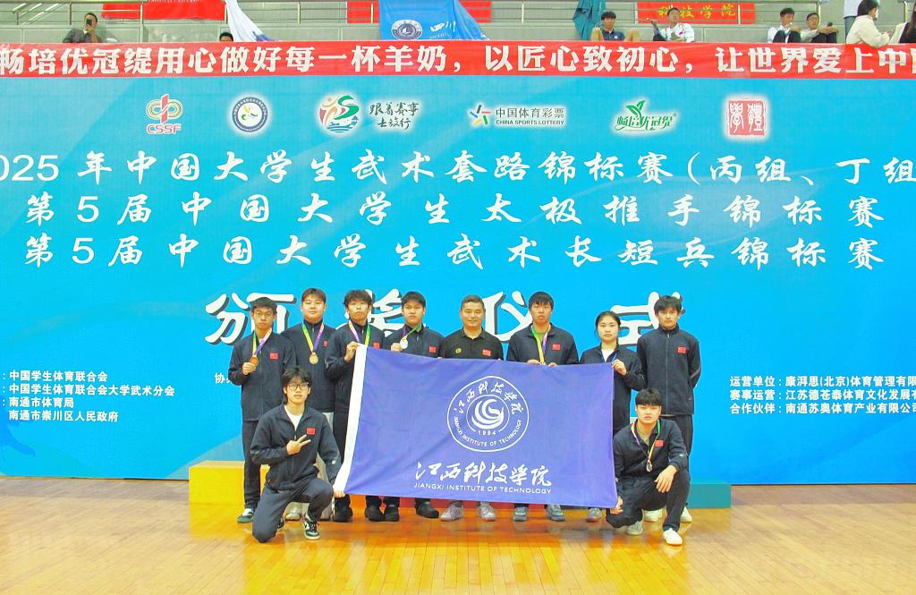 江科网讯(通讯员 黄宗信)近日,2025年中国大学生武术长短兵锦标赛在南通举行。我校武术队斩获3银3铜和男子甲B组团体总分第六名,教练陈蒋华获评“优秀教练员”荣誉称号。