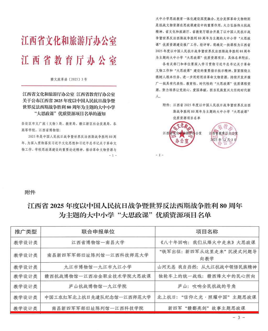 江科网讯(马克思主义学院)近日,江西省文化和旅游厅办公室、江西省教育厅办公室联合印发《关于公布江西省2025年度以中国人民抗日战争暨世界反法西斯战争胜利80周年为主题的大中小学“大思政课”优质资源项目名单的通知》,我校与南昌新四军军部旧址陈列馆联合申报的《新四军“赣鄱亮剑”故事主题思政课》成功入选。这是我校继2024年《用青春铺路 让理想延伸——井冈山革命故事主题思政课》荣获国家级推介项目后,以硬核实力在“大思政课”建设领域取得的又一重要成果。