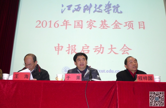 于果在讲话中强调,要建设高水平、有特色的应用型大学,必须有更高的目标,学校的内涵、质量和功能都要高要求。而申报国家基金项目就是必经之路,同时也是学校响应国家科技创新号召、贯彻科教兴国战略的重要举措。我们要下更大力气推动国家基金项目的申报。他对做好这项工作提出了四点要求。第一要有击鼓奋进的士气,要在全校、各学院以及各科研团队中树立敢于成功的决心和勇气。过去二十年,我们江科人就是靠着气贯长虹的高昂士气才实现了今天的辉煌。我们必须以更加昂扬的斗志,全校动员,大家参与,夺取科研工作的好成绩。第二要有大胆创新的勇气。在全国万众创新如火如荼开展的大潮下,我们的科研工作也要敢于突破、大胆创新。我校在创新的道路上已取得一些成绩,在内涵建设中也收获了大量成果,目前正处于已积蓄能量的释放期,希望我们的教师和科研工作者顺应潮流、把握机遇,争做科技创新的引领者。第三要有披荆斩棘的锐气。面对困难要敢于亮剑,要有“黄沙百战穿金甲,不破楼兰终不还”的意志和决心。目前我校科研工作纵向比发展很快,但横向比还存在很大差距。只有正视困难、奋起直追、突破险阻、全力攻坚,才能取得最终的胜利。四是要有厚德载物的风气。国家基金项目申报的最终目的是要在全校营造良好的科研、学术风气,全面提升我校的科研和学术水平。我们希望借助此次申报国家基金项目,努力创造百花齐放、百家争鸣的学术氛围,逐步构建我校优良的科研生态环境。