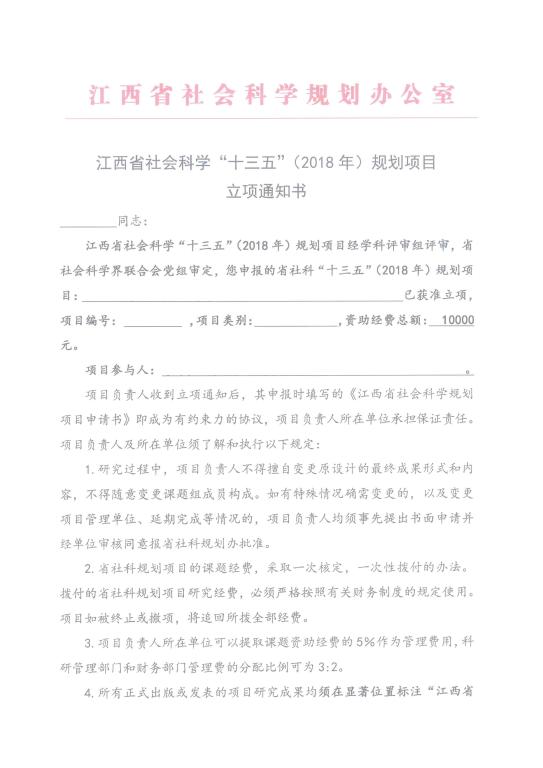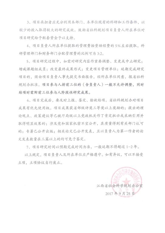 项目负责人收到立项通知后,其申报时填写的《江西省社会科学规划项目申请书》即成为有约束力的协议,项目负责人所在单位承担保证责任。项目负责人及所在单位须了解和执行以下规定: