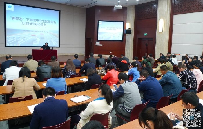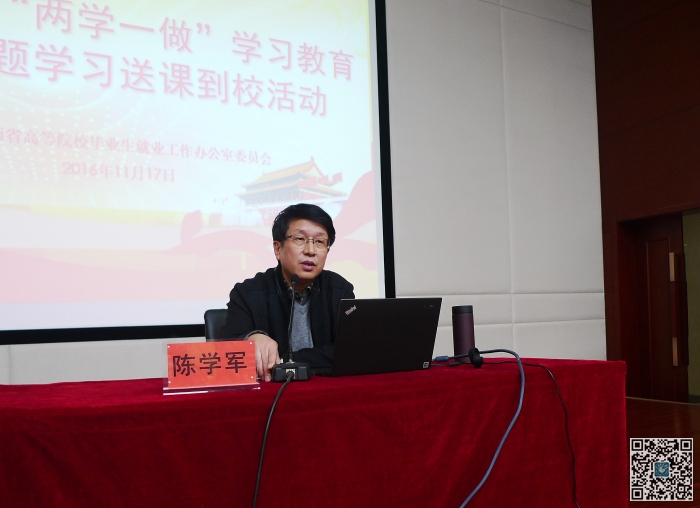 陈学军阐述了“新常态”下的大学生就业形势,深入分析了我省高校毕业生的就业流向,指出了今后一个时期高校毕业生就业创业的重点工作。他强调,高校要着力做好创新创业教育和毕业生自主创业工作,深入推进创新创业教育和实践活动,落实和完善创新创业优惠政策,加大创新创业场地建设和资金投入,不断提升创新创业服务质量;要突出重点领域,积极拓宽就业渠道。万哨凯在主持词中对陈学军的精彩讲座表示感谢。他说,在省高校毕业生就业办领导的指导下,在学校董事会、行政和党委的支持下,在各部门通力协作下,我们将不断提升管理效能,完善服务模式,真抓实干,力争我校毕业生就业创业工作再上新台阶。