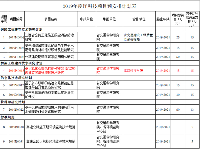 江科网讯(通讯员 张伟伟)日前,从江西省交通厅获悉,我校土木工程学院宋军伟院长主持申报的“基于氧化石墨烯的钢-UHPC组合梁桥面铺装层增强增韧技术研究”获批“江西省交通厅科技项目”立项。该项目年立项数不足十项,是土木工程学院科研团队在省交通厅科技项目上的首次突破,获批资助金额15万。获批省交通厅科技项目立项,意味着学校在服务地方经济方面迈出了重要的一步。