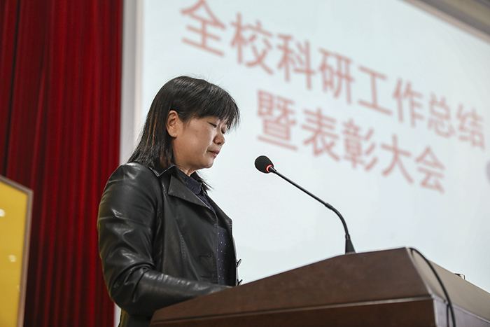 张海涛在大会上作工作报告。她指出,三年来学校将促进科研体制改革作为综合改革的重中之重,紧紧围绕“夯实基础,凝练特色,重点突破,整体提升”的工作思路,不断加大人才引进培养力度,加强科技创新机制建设,营造浓厚的科研氛围,科研工作呈现了良好的发展态势。她强调,全校教职员工要充分认识科研工作在高水平大学建设中的战略地位,适应新常态,抓住新机遇,迎接新挑战,取得新突破。对今后科研工作,她提出了两点要求:一是实现“两个转变”,即推动科研从偏重数量向数量与质量兼顾、以质量和创新为导向转变,推动目前存在的单兵作战过多的科研局面向以团队合作为主的局面转变。二是要做到“三个结合”,即坚持科研与学科建设相结合、坚持科研与教学相结合、坚持科研与社会服务相结合。