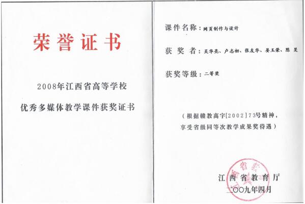 4.2008年,主持设计制作的《网页制作与设计》多媒体教学课件,在参加江西省教育厅组织举办的江西省高等学校第四届优秀多媒体教学课件大赛时,荣获二等奖。