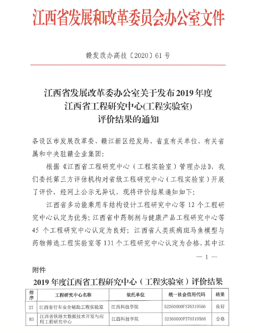 江科网讯(通讯员 张云)近日,从江西省发展和改革委员会下发《江西省发展改革委办公室关于发布2019年度江西省工程研究中心(工程实验室)评价结果的通知》(赣发改办高技[2020]61号)获悉,我校江西省行车安全辅助工程实验室评为“良好”,江西省铁路大数据技术应用与开发工程研究中心评为“合格”。