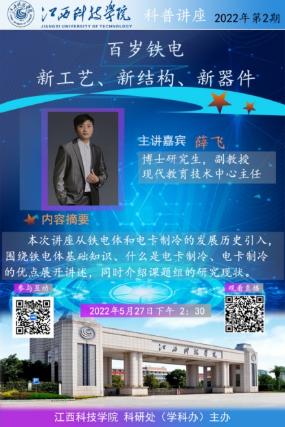 薛飞博士以“百岁铁电:新工艺、新结构、新器件”为主题,从铁电体和电卡制冷的发展历史引入,围绕铁电体基础知识、电卡制冷的含义、电卡制冷的原理、电卡制冷的优点等内容与师生进行交流,同时简要介绍了课题组的研究现状。薛飞博士指出,铁电体是一类具有自发电极化并在外场作用下可发生调制的多功能材料,铁电体在电卡制冷领域具有巨大的应用潜力。