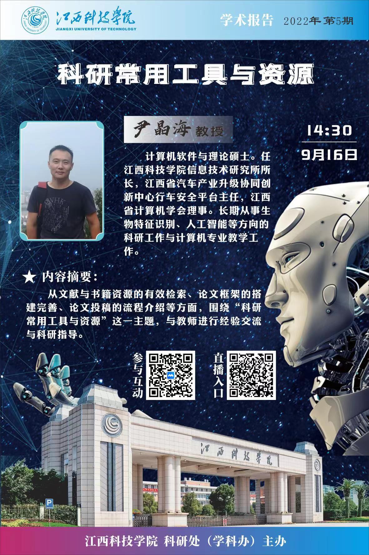 为进一步加强对我校教师的科研服务与指导,提高教师的科研水平和科研素养,9月16日下午,科研处(学科办)邀请学校2011协同创新中心尹晶海教授于腾讯会议开展2022年第5期线上专题学术报告。