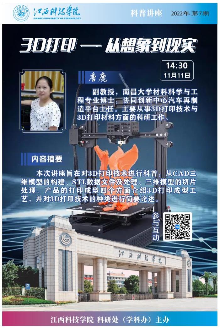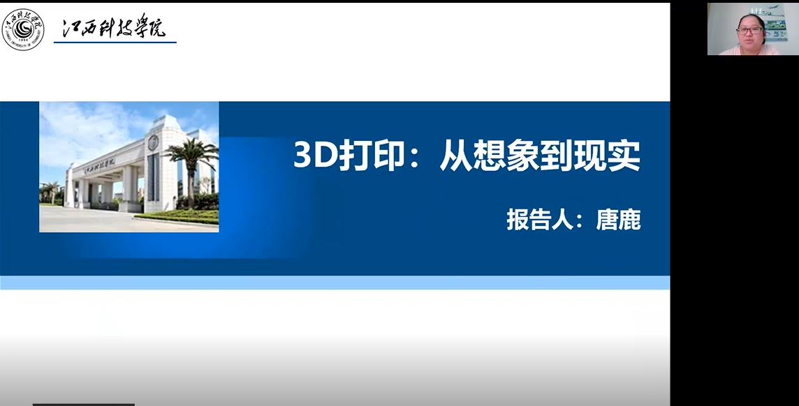 唐鹿老师以“3D打印——从想象到现实”为主题,从CAD三维模型的构建、STL数据文件及处理、三维模型的切片处理、产品的打印成型四个方面介绍了3D打印成型工艺,并对3D打印技术的种类进行简要了论述,指出了塑料3D打印、光固化3D打印、陶瓷3D打印、金属3D打印等多种方式的特性与优势。本次讲座内容生动丰富,讲解通俗易懂,激发了我校师生对于科学研究的兴趣与热情,取得了良好的科普宣传效果。