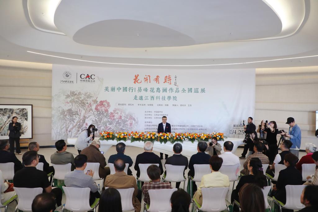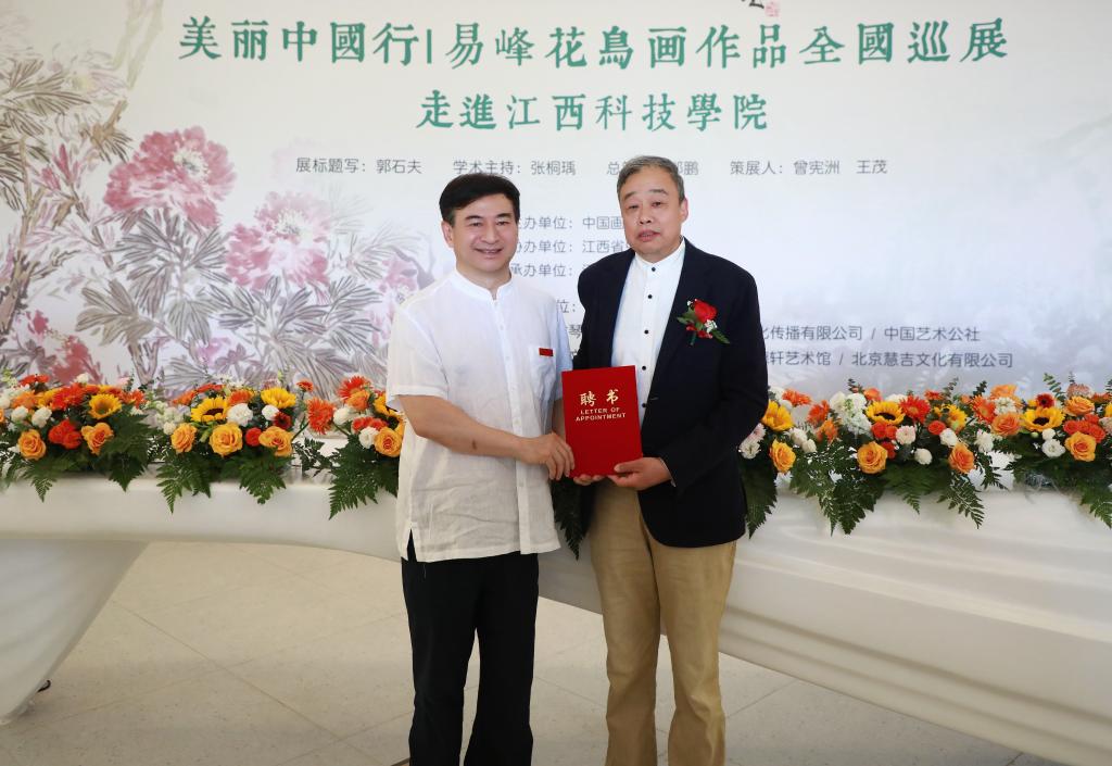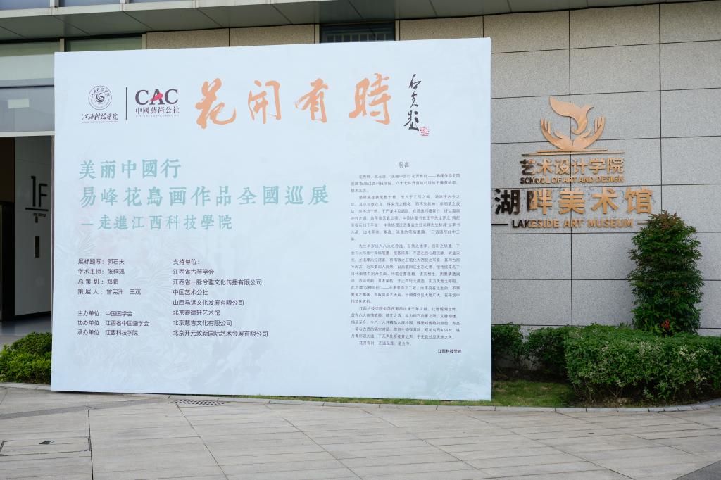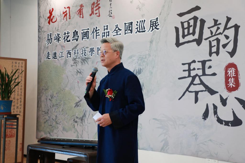 本次展览由中国画学会主办,江西省中国画学会协办,我校承办,并得到江西省古琴学会、江西省一脉兮雅文化传播有限公司、中国艺术公社、山西马远文化发展有限公司、北京睿德轩艺术馆的鼎力支持,共展出易峰先生近年创作的八十七件花鸟画精品。易峰先生深耕笔墨数十载,出入于工写之间,涵泳于古今之际,融汇历代花鸟笔墨精髓。八十七件精品佳作亮相校园,既是对中华传统书画文脉的传承与致敬,亦是一场跨越时空、与古贤对话的艺术盛宴。