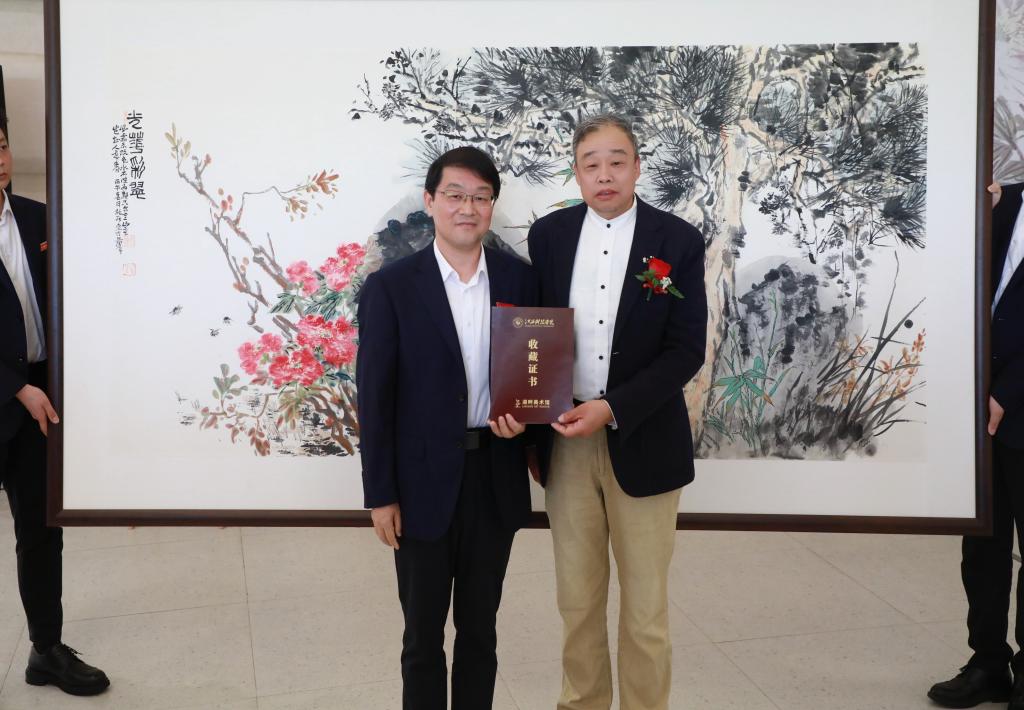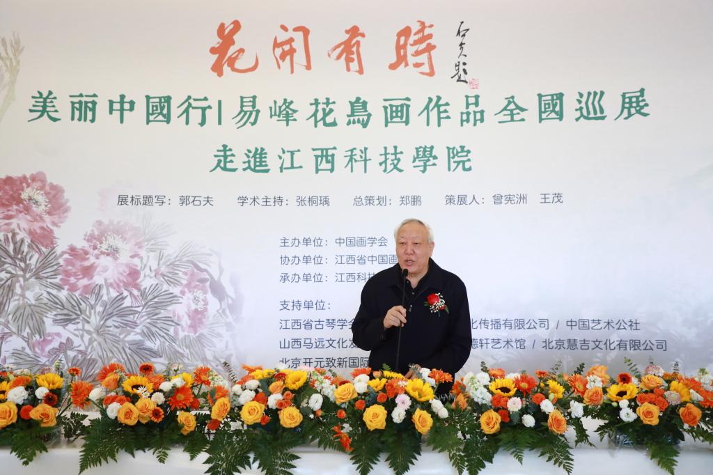 易峰致答谢词。他对江科的精心组织、各位领导与同道的大力支持表示诚挚谢意。他表示,此次巡展走进校园,旨在以笔墨为桥梁,将中华优秀传统文化带入校园,与广大师生共享花鸟画艺术之美,共品传统文化之韵。未来将继续潜心创作,以更多优秀作品回馈社会、助力美育事业发展。
